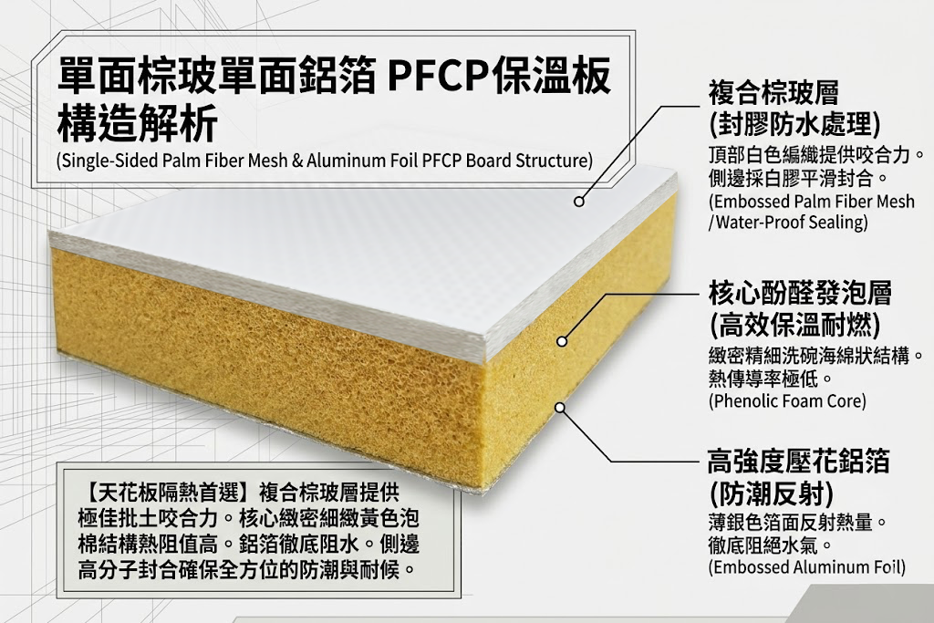 酚醛板(Phenolic Foam, 簡稱 PF)被譽為第三代新興保溫材料。它由酚醛樹脂經科學配方製成,長期使用溫度可達 150°C,壽命超過 30 年。具備極佳的耐燃性、極低發煙量與卓越斷熱能力,是日本建築體系及高規格公共工程(高鐵、機場、船舶艙壁)的指定防火保溫材。同時,它採用無 CFC/HCFC 發泡技術,是對臭氧層零破壞的環保綠建材。